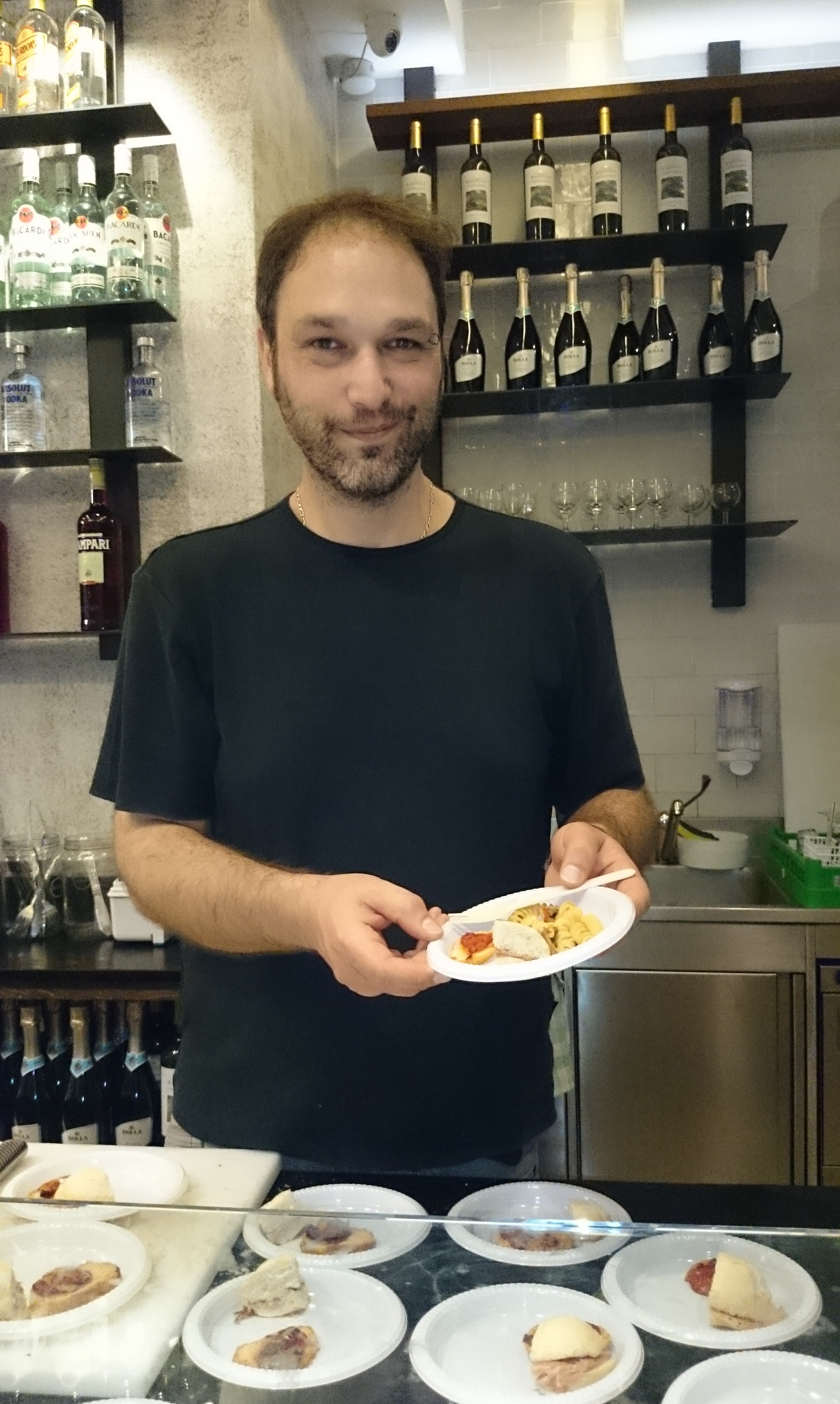 Assiette de dégustation du Pozzetto Salé composée d’une bruschetta, d’un sandwich mortadelle et salade de pâtes cuisinée à la méditerranéenne